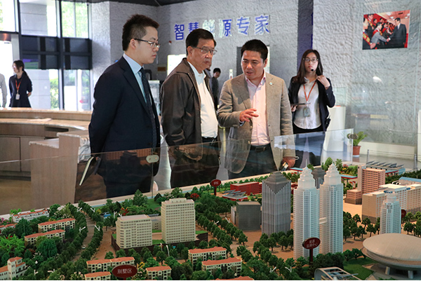 来访领导龙永图(右二)与蒋锡培(中)现场交流 蒋锡培为来宾讲解远东发展历史,智慧能源的运营、管理、战略布局等情况,龙永图被远东智慧能源科技馆中的现代化高科技展示深深吸引,仔细观察馆内各产品模型,体验产品不断优化发展进程,对远东企的发展有了更加深入的了解,并对远东取得的成就表示赞叹。