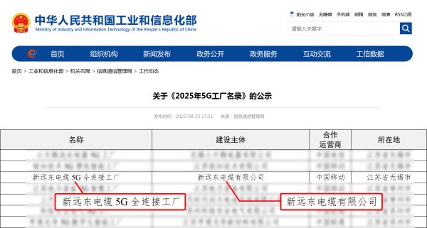 近日,工业和信息化部公示《2025年5G工厂名录》,新远东电缆有限公司凭借在5G技术应用与工业互联网融合发展方面的突出表现成功入选。